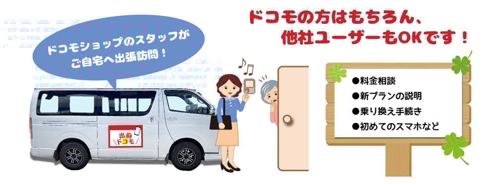 ドコモショップへ何らかの理由で来れない人、仕事場でまとめて応対する等、様々なケースを想定して、ドコモショップが出向いて、サービスを提供しています。命を守るために利用されている独居高齢者のお宅へも要望があれば出前をしています。地域密着の店舗だからこそ出来るサービスです。ご希望があれば遠慮なく申し出ください。